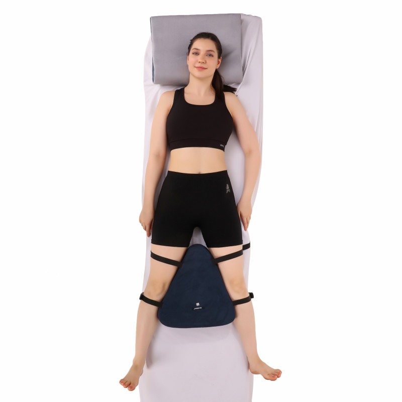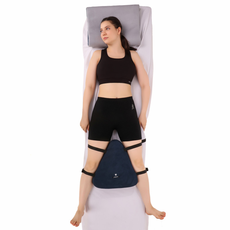 Hip Abduction Pillow is a soft but firm foam pillow that is used to prevent your hip from moving out of the hip joint. It is used as a support after hip replacement surgery to limit the movement of hips and for providing comfort. It is also ideal for people with Hip Dysplasia. It is triangular in shape in order to naturally fit the shape of a patient’s inner thigh area. The pillow also has two sets of straps near the top and the bottom. It is placed between the thighs and is strapped onto the patient's legs while they are in a resting position. It is often suggested after invasive surgeries that require stabilization of the lower body as a part of the healing process. It provides patients with a way to control the movement of their lower body, stabilize their hips at a prescribed angle, and provide peace of mind to patients who worry about unwanted movements during sleep. It is a simple and accessible way to facilitate the overall healing process. Recommended by Physical Therapists, Doctors, Sports Trainers, and Chiropractors. Available in Universal size 18" x 11" X 4" . Note: You may need to use an abduction pillow for several weeks.