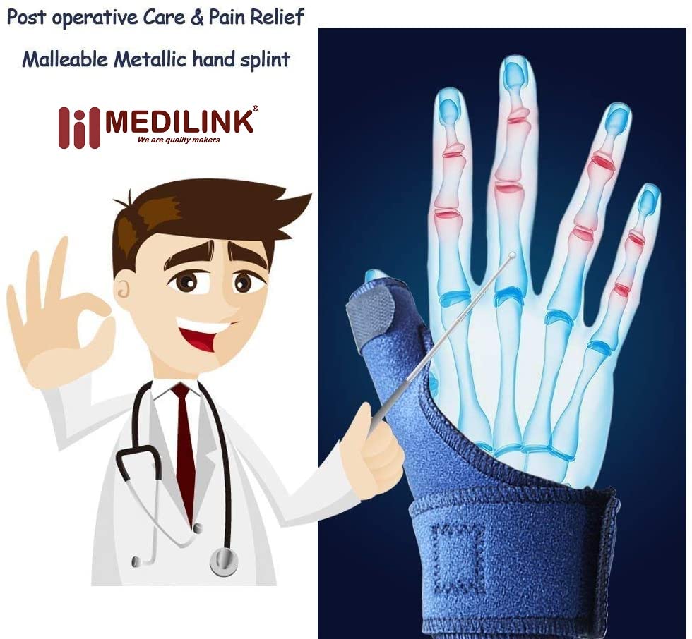 • Medilink Thumb Spica Splint is made out of flexible breathable 3-layered PUF fused fabric. Removable malleable splint supports the thumb in abduction and immobilize the CMC and MCP joints of the thumb.